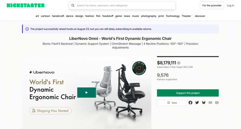 近日,深圳品牌 LiberNovo(清闲智能)推出的全球首款动态人机工学椅 Omni 在海外市场引发了轰动。自 6 月 24 日登陆 Kickstarter 众筹平台以来,该产品迅速吸引了全球消费者的目光,上线 小时内,众筹金额即突破约 675 万人民币。截至目前,众筹金额已突破 800 万美金(约合 5700 万人民币),斩获近万名用户支持,成为 2025年Kickstarter 平台近期现象级项目。
